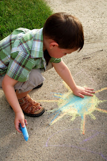 Last week, during Jill's visit, we had the "Lehman" side of the family over to eat and visit with Jill's family. Jenna (almost 6), Luke (4...today! HAPPY BIRTHDAY), and Rylee (3) had lots of fun playing together outside. They started out playing on the swings. At one point, I asked if anyone wanted to go out front and play with chalk and bubbles. Rylee said "YEA! Chocolate bubbles!!". I think chocolate bubbles might have been a little less messy!! They started out playing with bubbles, and then moved on to chalk. Somewhere in the middle, Rylee tried to pour bubbles from a gallon jug and poured them all down our driveway. Immediately all three were stomping in the bubbles.....and then they decided it would be fun to color in the bubble mess with chalk!! By the end, the three of them AND our driveway were colored with bright blue bubble chalk!!