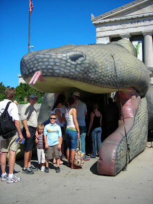 Getting ready to go into the aquarium (we had to wait in a long line to get in!). They had a special exhibit of lizards and komodo dragons, so they had this huge inflatable Komodo dragon that you walked through to enter the museum. Unfortunately, we ran out of time and didn't get to see the exhibit (I'm still not sure why lizards and Komodo dragons were at the aquarium though!). Jacob was really bummed we didn't get to see them.