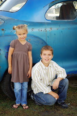 Living in a small town, I tend to use the same locations over and over. A few weeks ago - after our visit to the pumpkin patch - I decided to try a new location I had spotted. Just as I was getting ready to take Jacob's photos, the man who owned the business (and the building?) drove up (in a fun car!). I checked with him to make sure it was okay we were taking photos there, he gave us permission and then he gave me a brief history of the building. I took photos of both kids and then used the great older car the man had driven. It made a great backdrop, too! This location also gave me a chance to use some fun actions in photoshop - kind of old school or grungey looking. This spot will definitely be added to my list of favorite photo locations. I can't wait to use it again.