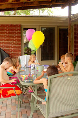 Jenna invited 6 friends over to celebrate her birthday last Wednesday. She decided she wanted to just do things outside - so we set up the sprinkler and also had lots of bubbles and sidewalk chalk. They had a great time playing in the water and trying to make huge bubbles. Later she opened gifts and they ate chocolate chip ice cream sandwiches (with sprinkles!) on the patio. She doesn't really like cake much, so we always have to get creative when it comes to birthday treats. The ice cream sandwiches were a huge hit!! We also had her beads set up on the patio, and they spent some time making bracelets before it was time to go home. The whole thing went really smoothly, thanks to a little help from Grandpa and Grandma Davis and Chris, great weather, and a good bunch of kids.