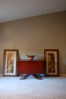 The opposite end of the room. The dining room table belonged to Chris' grandma. Unfortunately she no longer had the chairs, so I have been searching antique stores trying to find some chairs that will work. The two prints are going to be hung on the wall above the table.