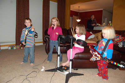 We spent New Year's Eve at Brenda's - just hanging out, eating lots, and playing Rock Band. For the record, I am a pretty good drummer, but Jill rocked the lead vocals and Mia was definitely our star back up dancer. Marcus was brave enough to invite his girl friend over to join us - I'm sure she was more than a little overwhelmed by all of us! Brenda even broke out the sparkling grape juice for the kids and they thought they were so grown up. We also took them outside and let them throw poppers on the ground and make lots of noise. Sadly, I did not even try to tough it out and was in bed by 10:30 or so. I think the kids and Grandma and Grandpa managed to stay up a little bit longer, but I'm not sure anyone actually made it till midnight.
