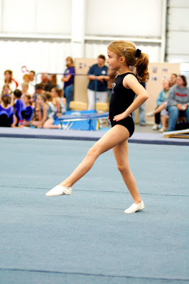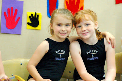 Saturday was Jenna's gymnastics "meet" at Flip Tuck Gymnastics Center. She has been taking gymnastics there since last June and absolutely loves it. The girls did their routine on each event - bars, beam, floor, and vault - and got ribbons based on their performance on each. Jenna got blue ribbons (highest achievement) on bars, beam, and floor and got a red (higher achievement) on vault. She went through her vault routine too quickly and forgot to "salute" at the end of her vault. . At the end of the "meet", each girl got to go up on the podium and receive their participation medal.